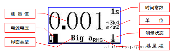 3.测量界面:在主菜单下,用“光标左/右”键将光标移到“1.振动测量”上,按“进 入”键,进入测量子菜单,测量子菜单下有多种显示界面,如大字显示﹑列 表显示、频谱界面(选配频谱分析功能)、状态信息界面。 4.测量设置:在主菜单下,用“光标左/右”键将光标移到“2.测量设置”上,按“进 入”键,进入测量设置子菜单。