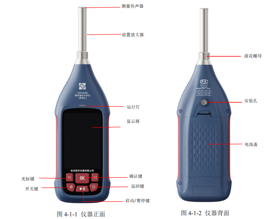 2025-07-14 11:33:47 来源:宁波经济技术开发区凯诺仪器有限公司 新款噪声振动分析仪AWA5688A由测量传声器、前置放大器和主机组成。前置放大器安装于仪器上,逆时针旋松前置放大器的滚花螺母,可以拆卸整个前置放大器。仪器正常工作时应将测量传声器安装于前置放大器上,逆时针旋动传声器可以将传声器从前置放大器上取下。声级计的顶部呈尖形,以减小对声波的反射。外壳用ABS+PC注塑而成,声级计外壳引起反射的标称影响及在不同入射方向时声级计的指向特性见附录A。电池为6节LR6碱性电池,装在电池仓内,可取下电池盖板直接更换电池。仪器显示器为3.5英寸彩屏显示器,分辨率为320x480的电容触摸屏,除开关机外其余操作均可由触摸完成。开关键按住1s能开或关仪器(关机前会有关机提示)。 (1)开关键:长按1s开关机;
