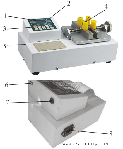 瓶盖紧合扭矩数显测试仪各部件的名称与功能: 1、液晶显示屏 2、显示灯 3、功能按键 4、专用夹具