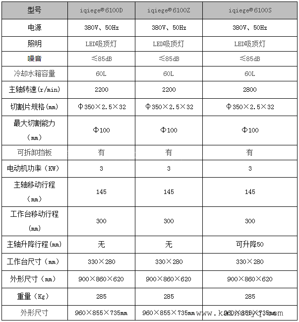 详细信息| 询价留言品牌:蔚仪 型号:6100Z 切割能力:Φ100 空载转速:2200 rpm 额定功率:3 w 额定转速:2200 rpm 功率:3 w 锯片直径:350×2.5×32 mm 最大锯切深度:100 mm 重量:285 kg 加工定制:否 最大锯切深度:100 mm 手自一体切割机蔚仪6100Ziqiege®-6100系列手自一体式切割机是由机身、电控箱、切割室、电机、冷却系统、切割砂轮片等部件组成。本系列切割机不但可以切割直径为100mm以内的圆形工件,还可以切割高70mm、宽100mm以内的长方形试样。另外,个别机型可根据锯片消耗量,实时调整主轴高度。该系列切割机通过冷却系统对试样进行冷却,以防止试样在切割过程中过热而烧坏组织。可以切割试样选择3种不同的切割模式,并能对切割进给速度和切割行程进行设定,从而提高了切割试样的质量。该系列切割机分手动切割和自动切割。并具有安全保护和运行提示功能,更便于人机的对话。大容积的切割室,更便于切割者使用,是大专院校、工厂企业金相试验必备的取样设备之一。