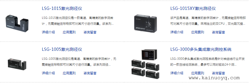 LSG微细线测量系列:LSG-1015激光测径仪、LSG-1015XY激光测径仪、LSG-3000多头集成激光测控系统等。如需了解具体资料,可以致电销售经理。 我司宁波凯诺仪器是一家综合性仪器销售公司,主要经营: