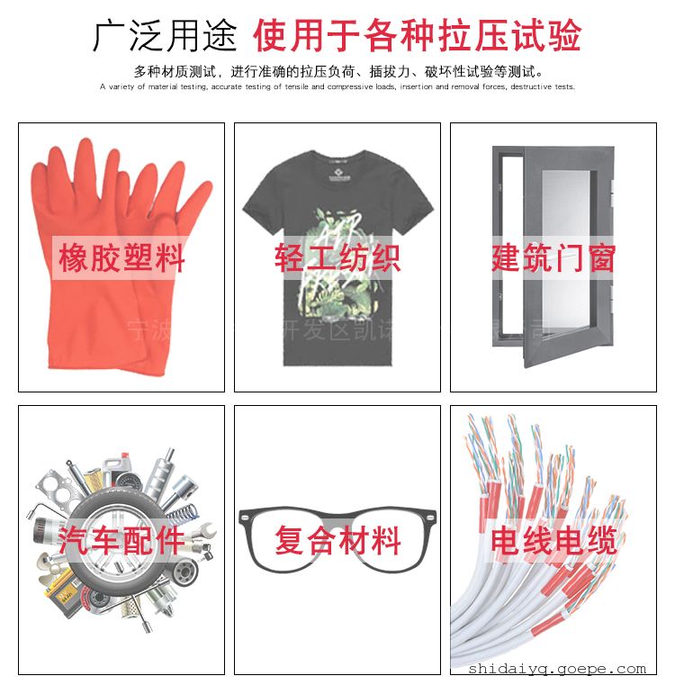 7.具有紧急停止功能。 用途广泛,可测试多种材质的拉压负荷、插拔力、破坏性试验等测试。橡胶塑料、轻工纺织、建筑门窗、汽车配件、复合材料、电线电缆等多种行业。
