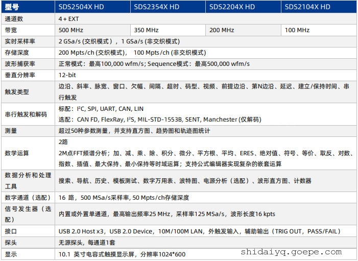 鼎阳台式高分辨率示波器SDS2000X系列具体型号参数:- 配备 10.1 英寸 TFT-LCD 大显示屏,分辨率1024*600