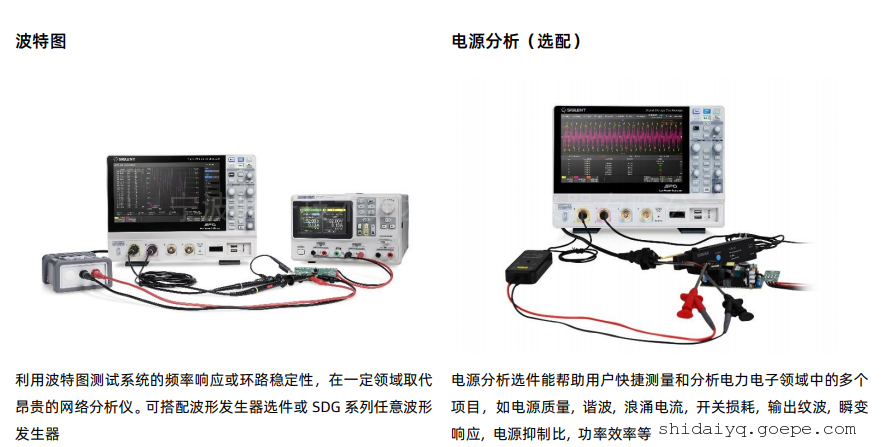 SDS2000X系列鼎阳台式高分辨率示波器创新的数字触发系统,触发灵敏度高,触发抖 动小;支持丰富的智能触发、串行总线触发和解码;支持历史 (History)模式、分段采集(Sequence)、模板测试、搜索、 导航、波形直方图、波特图和电源分析等高级分析模式;具备 丰富的测量和数学运算功能。SDS2000X HD 采用了 10.1 英 寸电容式触摸屏,支持多种手势实现对波形和菜单的常用操 作,结合前面板的多个一键操作按键,很大优化了操作示波器的效率,提升了用户体验。