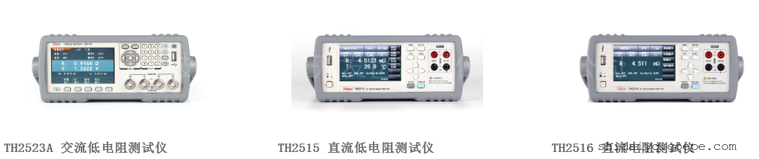 TH2516直流低电阻测试仪技术参数:产品型号 TH2516 TH2516A TH2516B 显示器 24位色;分辨率为480 X 272的RGB真彩色TFT LCD显示器带触屏功能 读数位数 4 ½ 位 测量范围 1μΩ - 2MΩ 10μΩ - 200kΩ 1μΩ -20kΩ 电阻量程 20mΩ