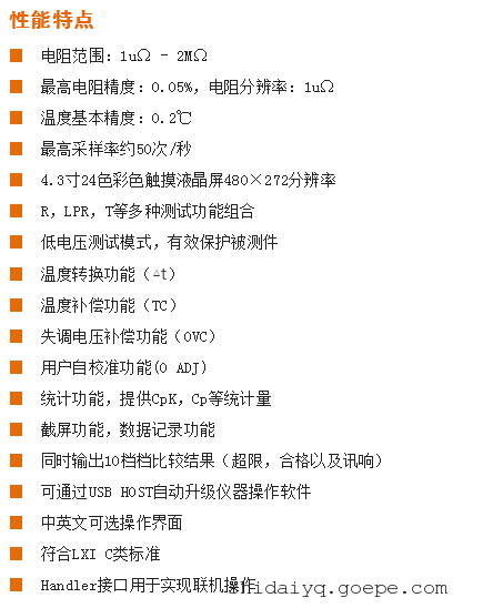 (TH2516A/B无)基本测量准确度 0.1% 0.05% 0.2% 电阻测量时间 FAST:10ms;MED:25ms;SLOW1:115ms;SLOW2:455ms 温度测量时间 100 ± 10ms ------ 测试端配置 四端 低电压测量 开路电压: ≤ 40mV 有效量程: 2 Ω , 20 Ω , 200 Ω , 2kΩ ------ 热电势消除 √ ------ 统计功能 平均值、*大值、*小值、总标准偏差、采样标准偏差、工程能力指数(分散性Cp、偏向性CpK) 测量设置参数保存 30组