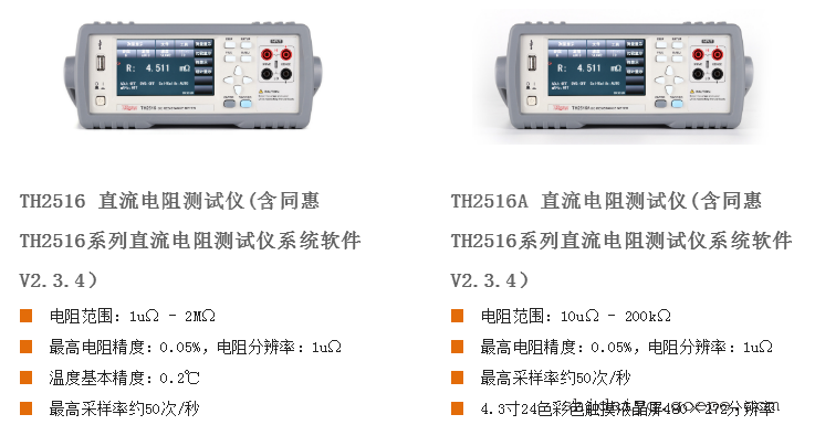 TH2515低电阻测试仪技术参数:产品型号 TH2515 显示器 24位色;分辨率为400 X 272的RGB真彩色TFT LCD显示器带触屏功能 读数位数 5 ½ 位 测量范围 0.1μΩ --110MΩ 电阻量程 电流 分辨率 准确度 Rd%+FS% 20 mΩ 1A 0.1μΩ 0.10+0.025 200mΩ 1μΩ 0.35+0.030 2Ω 100mA 10μΩ 0.035+0.010 20Ω 10mA 100μΩ 0.025+0.008 200Ω 1mΩ 0.01+0.002 2kΩ 1mA 10mΩ 0.01+0.002 20kΩ 100μA 100mΩ 0.01+0.002 100kΩ 1Ω 0.01+0.005 1MΩ 10μA 10Ω 0.02+0.005 10MΩ 1μA 100Ω 0.1+0.010 100MΩ 100nA 1kΩ 1+0.1 测量功能 电阻测量时间 FAST:7ms;MED:22ms;SLOW1:102ms;SLOW2:402ms 以上为DISPLAY OFF,当DISPLAY ON 另加20ms。 温度测量时间 100 ± 10ms 测试端配置 四端 测量平均设置 1-255 清“0” √ 量程切换 自动、手动 触发方式 内部、手动、外部、总线 电源频率选择 √ (避免电源噪声干扰) 测量设置参数保存 30组 低电压测量 开路电压:≤ 60mV有效量程:2Ω, 20Ω, 200Ω, 2kΩ 热电势消除 √ 统计功能 平均值、*大值、*小值、总标准偏差、采样标准偏差、工程能力指数(分散性Cp、偏向性CpK) 测量异常检测 √ 检测测量线是否连接正常 多极连接器 √(可选高阻测试噪声抑制功能) Beep工作状态 比较器、档比较、按键 按键锁定 √ 温度测量 温度测量1 -10.0℃--99.9℃ 传感器:PT500 温度测量2 模拟输入:0V--2V 显示:-99.9℃ - 250℃ 温度补偿功能 (电阻测量值转换为设定温度时的阻值) 温度转换功能 (由加温前后电阻测试值获得温升) 比较判别 比较器 信号输出 HI/IN/LO 讯响 鸣叫模式:OFF,IN,HI/LO 极限设置方式 绝对值上/下限,百分比上下限+标称值 分选 10档,绝对值/百分比 外触发延迟时间 自动:由量程、低电压模式ON/OFF、OVC(失调电压补偿)ON/OFF决定手动:0.000--9.999s 外输入触发 上升沿/下降沿可选 接口配置 USB DEVICE 、USB HOST 、RS232、LAN、HANDLE R、GPIB(OPTION) 一般技术指标 温度、湿度 0℃ -- 40℃,≤ 90%RH 保证精度温度 湿度 23±5℃ ≤80%RH 供电电源 电压 110V~220V 频率 50Hz/60Hz 功耗 30 VA 尺寸 215mm×87mm×335mm(净尺寸) 235mm×105mm×360mm(加护套后) 重量 约3.6kg