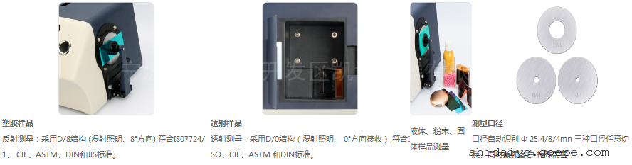 符合标准CIE No.15,GB/T 3978,GB 2893,GB/T 18833,ISO7724/1,ASTM E1164,DIN5033 Teil7特性 塑胶电子、油漆油墨、纺织服装印染、印刷等行业反射样品、透明样品颜色传递和质量控制方面。 积分球尺寸 Φ154mm 照明光源 360~780nm氙灯,400nm截止氙灯 分光方式 凹面光栅 感应器 256像元双阵列CMOS图像感应器 测量波长范围 360~780nm 波长间隔 10nm 半带宽 5nm 反射率测定范围 0~200% 测量口径 反射:Φ30mm/Φ25.4mm,Φ10mm/Φ8mm,Φ6mm/Φ4mm;