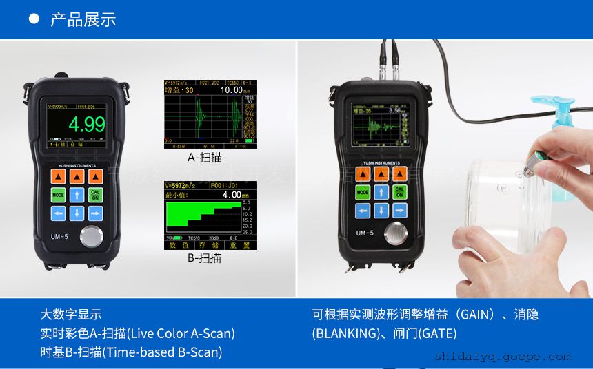 UM-5DL型超声波测厚仪能快速,无损伤,精确地进行测量。并且本仪 器提供 A、B 扫描功能,通过回波显示可以帮助使用者更好的控制测量, 使测厚范围更广,测量数值更精确,也可避免在测量中与材料相关的误差。