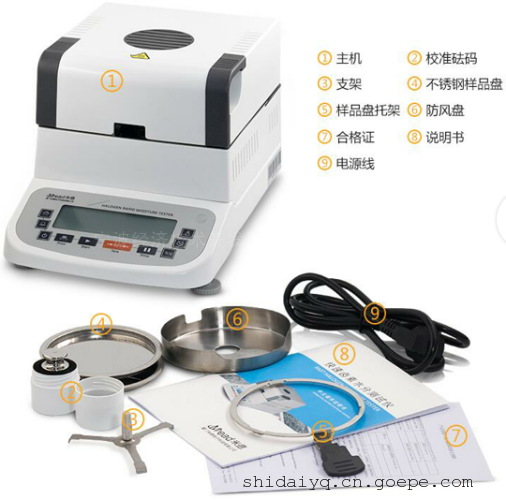 12.配备RS232通讯接口,可以连接打印机和电脑等其它外围设备。QL-610A型水分测试仪产品包装清单: