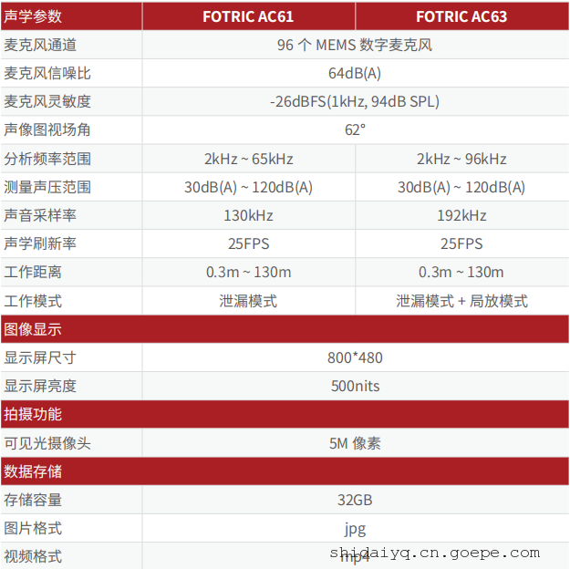 FOTRIC AC60系列分为:AC61泄漏声像仪和AC63局方声像仪,主要参数如下