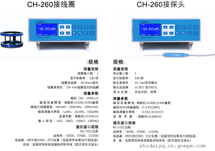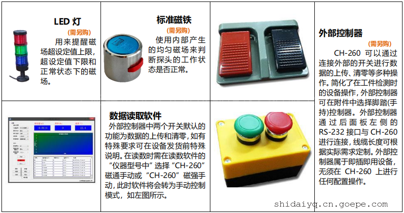 CH-260型是一款高精度的磁通计/高斯计接线圈及接探头对比: CH-260型磁通计/高斯计可选配多种配件:LED灯、标准磁铁、外部控制器、亥姆霍兹线圈、磁通计套线线圈、一维横向探头、一维轴向探头等。(配件需另外购买) 相关系列产品:CH-290型磁通计/高斯计