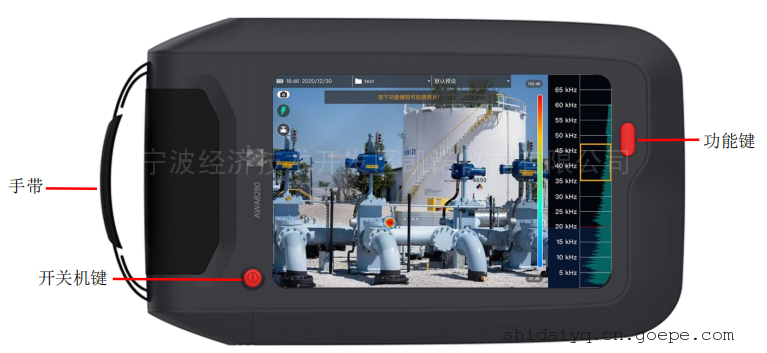 AWA6280 型声学成像仪是一款用于检测并定位声信号源的声学仪器,可以检测压缩空 气、压缩气体和真空系统中的泄露,也可以排查放电和漏电点。 AWA6280具有声学传感器阵列可以将声源热力图和摄影图像匹配,在图像中标记出泄 露位置,对问题点进行定位,可以捕获并保存图片和视频文件,以留存检查记录。