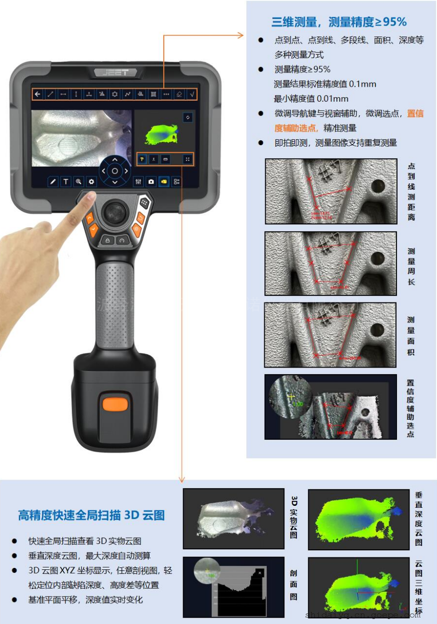 电控三维测量内窥镜JXP系列,它具备快速高精度全局扫描的功能,可实现3D云图建模和三维测量,测量时微调导航键与置信度辅助选点,实现精准测量;采用摇杆电动控制方向,快/慢速控制导向,步进微调,精准转向定位,检测更高效,便捷。