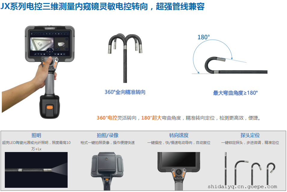 8)产品经过严格的高低温、跌落、震动等测试电控三维测量内窥镜JXP系列主要参数: 整机结构 手持一体化主机 标准精度值 0.1mm 屏幕尺寸 7英寸触摸屏 人性化界面按键 *小精度值 0.01mm 外壳材质 工程合金材料+航空铝合金 准确度 ≥95% 管线材质 耐磨钨合金丝编制管 转向方式 360°电动一体转向结构 屏幕分辨率 1920*1200 探头定位 转向锁定,可微调探头 光源 光纤/LED 有效工作长度 1.5m/2m/3m(其它长度可定制) 弯曲角度 180° 续航时间 4小时,可支持在线充电使用 视场角 90°/120° 电池容量 7.4V/6400mAH 视频输出 HDMI同屏输出 储存介质 内存储/SD卡/U盘(选装) 防水、防尘等级 探头、物镜、管线能承受IP67防水 整机重量 约2.3kg 操作系统 实时智能多任务操作系统 兼容性 兼容不同规格的管线系统 数据接口 USB×1 、mini HDMI×1、Type-c×1、SD卡口×1、3.0耳机孔×1 标准配置 专用仪器箱、内窥镜、电池模块、充电器、读卡器、储存卡、数据线、使用说明书、合格证等 管线系统 探头直径 像素 有效工作长度 视向 景深 视场角 光源 弯曲方向 8.0mm/