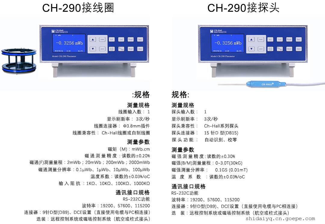 智能型高精度磁通计/高斯计CH-290型可以测量总体磁通量,从而得到磁通密度与磁场强度的值,CH-290 磁通计在充磁机中、手动与自动磁体检测和分类中、磁滞回线测量系统都是十分有价值的部件,是磁通及磁强测量的理想工具,可接霍尔探头更精确测试磁场强度,是全数字化多用机。