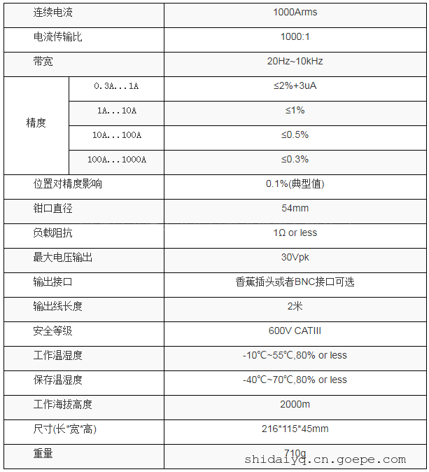 低频交流电流探头CP1000B电流探头用于交流电流测量,被测电流达到 1000A 有效值,电流传输比为 1000:1,带宽到 20Hz~10kHz。钳口直径约 54mm,香蕉插头或者 BNC 接口可选,方便连接功率分析仪等设备,广泛应用于电机驱动,逆变器,开关电源,航空电子等测量中。