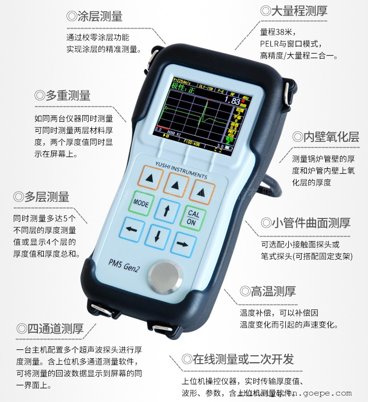 -     PM5 Gen2宇时超声波测厚仪详细信息| 询价留言品牌:宇时 型号:PM5 Gen2 加工定制:是 测量范围:0.01-3800 mm 测量误差:标准 测量分辨率:0.001 数据存储:100000个厚度值 工作频率:0.5-20 MHz 外形尺寸:100 mm