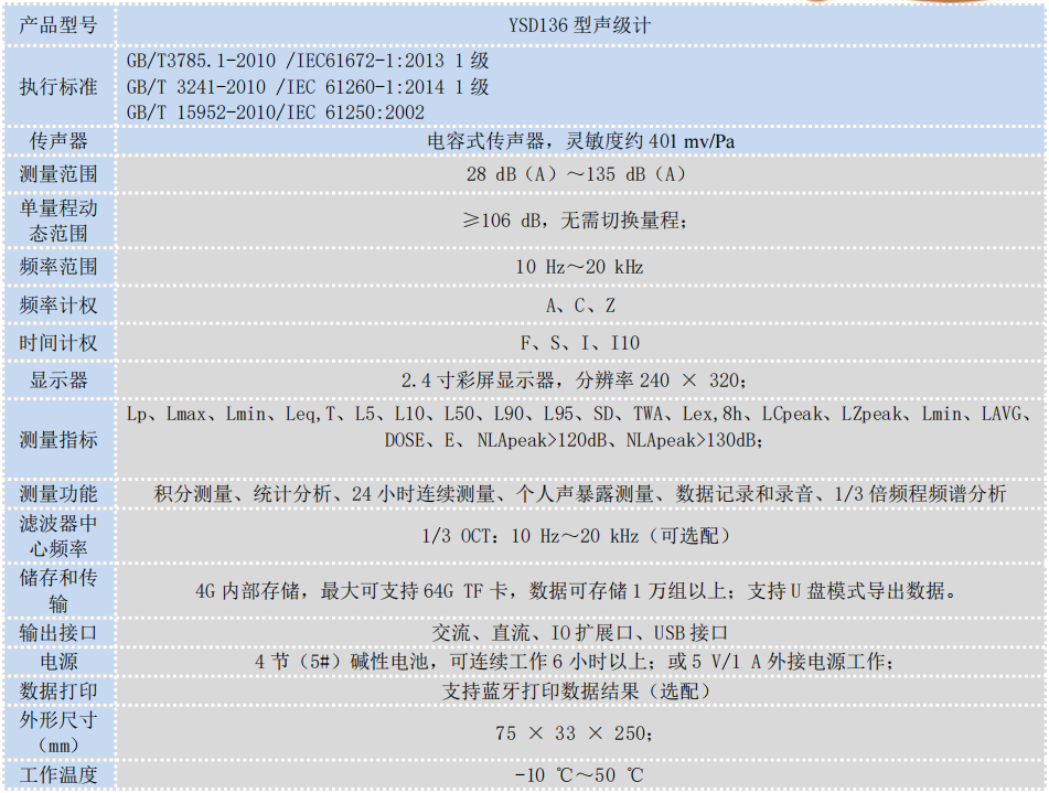 固定岗位且有防爆要求的建议选用 YSD136 本安型声级计;无防爆要求时可选用 AWA6292 型、AWA5662 型声级计(1 级)或 AWA5688 型、AWA5636-2 型声级计(2 级) 本安型声级计YSD136型主要性能指标: